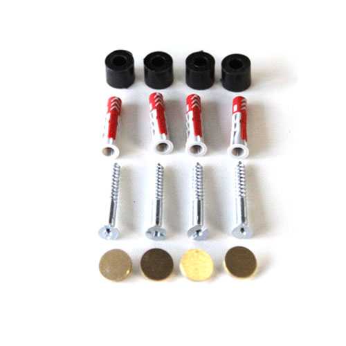 Het bestaat uit een setje van 4 schroeven, pluggen, GOUD look afdekkapjes en 4 zwarte afstandhouders.