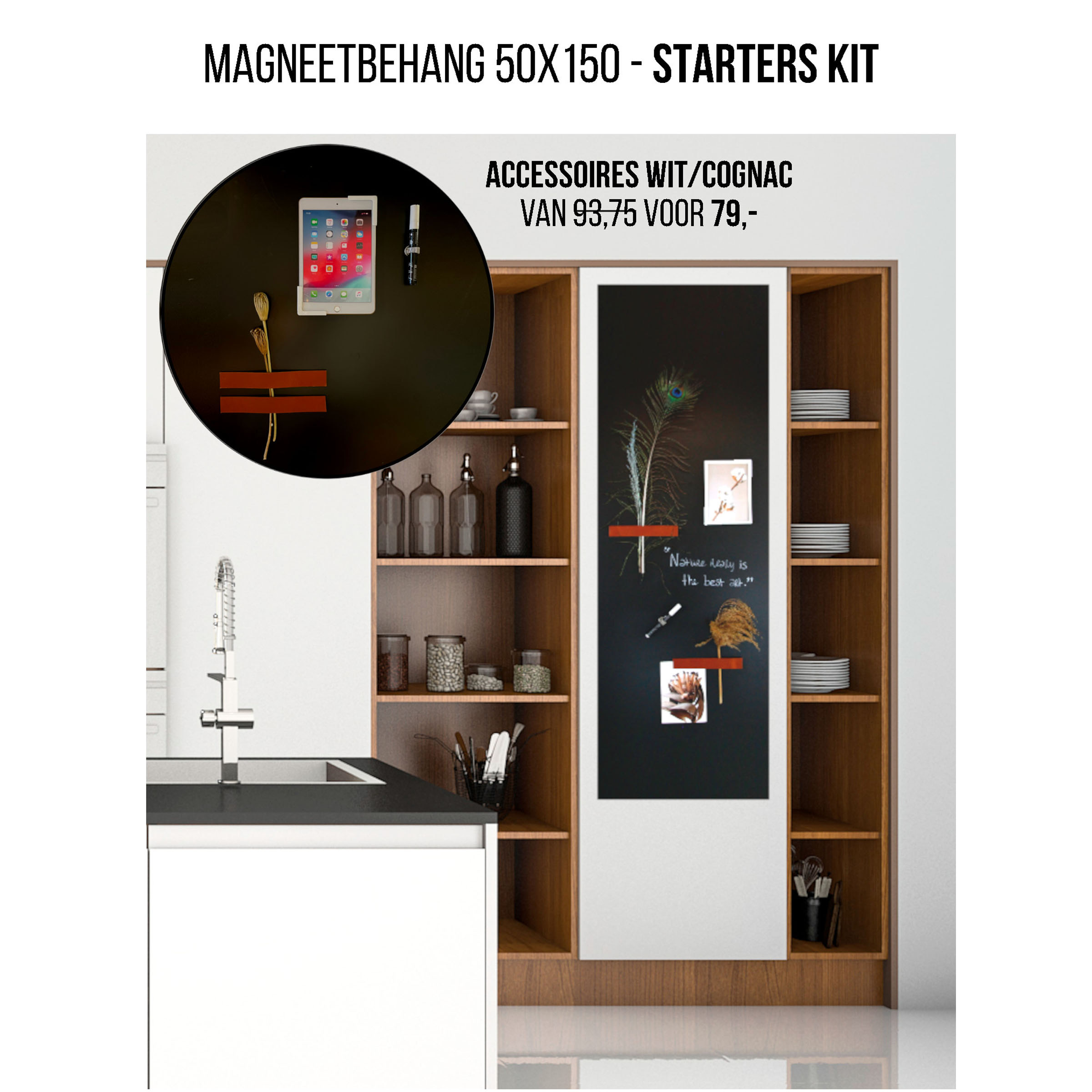 Het magneetbehang zwart dat in deze starterskit zit plakt makkelijk op vlakke ondergronden zoals een latex muur of een zijkant van een keukenkast. Het is niet te gebruiken op structuurmuren. Dan kun je ook een dun houten plaatje op de muur aanbrengen en het magneetbehang daarop aanbrengen. Muren die geschilderd zijn met speciale waterafstotende verf moeten eerst overgeschilderd worden met normale latex voor een goede hechting.